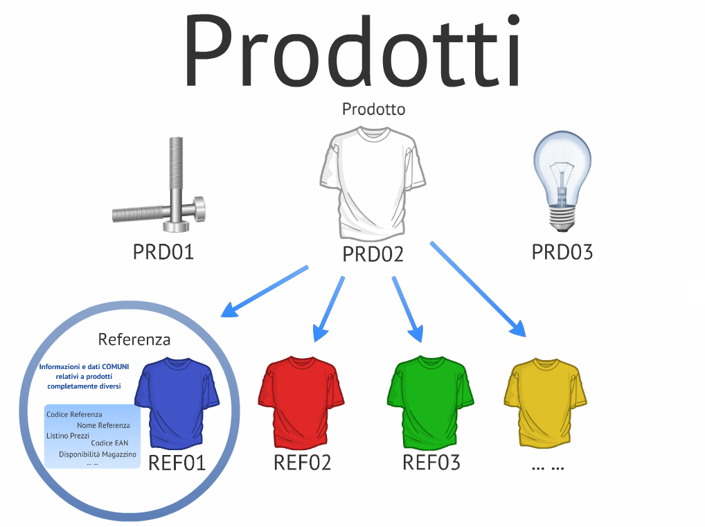 Solitamente il prodotto viene trattato in due livelli: un primo livello riporta le informazioni comuni, indipendenti dalla natura del prodotto quali nome, codice, marchio etc.; un secondo livello suddivide il prodotto in referenze (o articoli) in base a caratteristiche distintive. L'articolo è l'effettivo bene materiale che viene commercializzato e venduto, pertanto gli viene assegnato un proprio codice, il listino prezzi, la disponibilità in magazzino e tutti i dati necessari per gestirne la vendita.