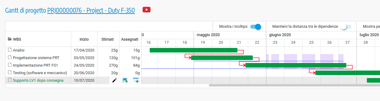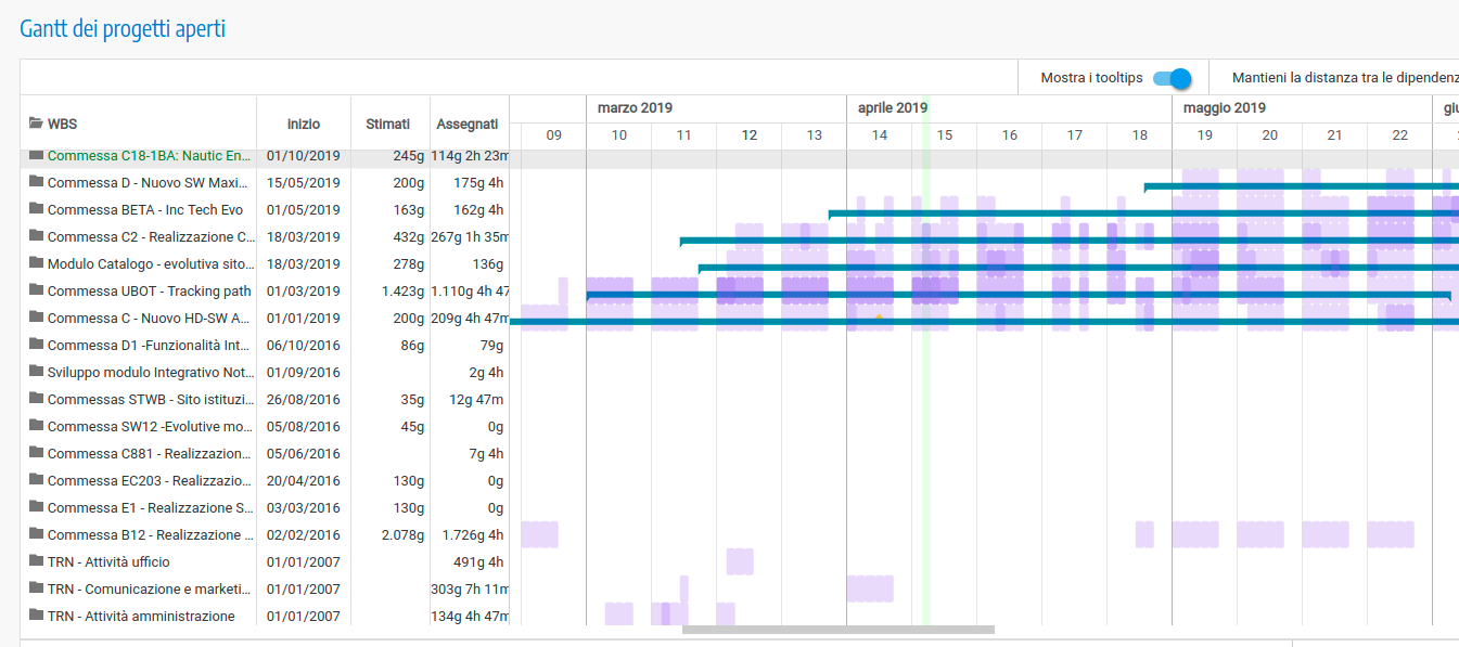 Di seguito un diagramma che rappresenta un insieme di progetti (in corso) e le attività lavorative (fisiche) eseguite o pianificate: