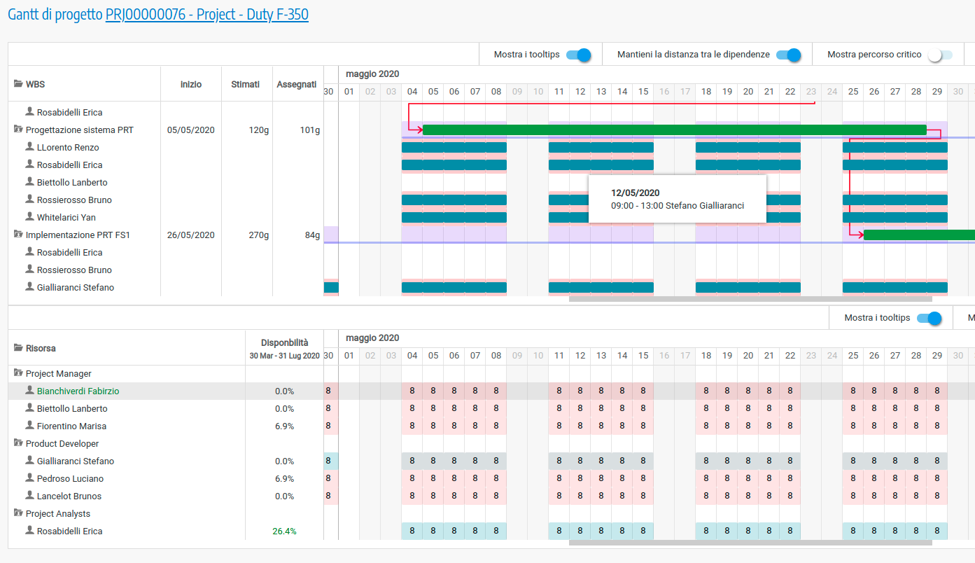 Esempio di diagramma di Gantt delle attività e delle risorse nel software T-GANTTDi seguito il diagramma di gantt con attività, risorse e impegno delle risorse: