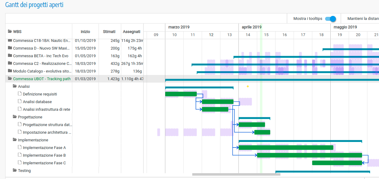 Esempio di diagramma dei progetti attualmente in corso di esecuzione nel software T-GANTT Di seguito un diagramma che rappresenta un insieme di progetti (in corso),le attività lavorative (fisiche) eseguite o pianificate e le attività/tasks (esplose) di un singolo progetto;