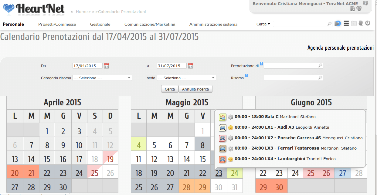 Spostando il mouse su un determinato giorno vengono mostrate le risorse prenotate, il tempo e l'utilizzatore.