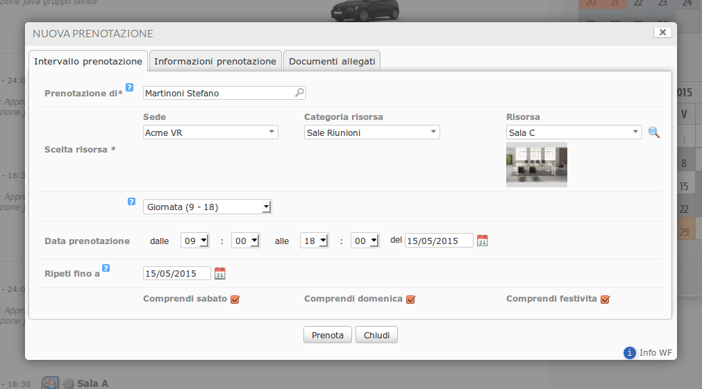 Una risorsa può essere prenotata per un intervallo di tempo variabile, che può coprire anche più giorni. È anche possibile definire prenotazioni ricorrenti (ad esempio richiedere una sala riunioni dalle 09:00 alle 11:00 per tutta la settimana) e specificare se includere sabati, domeniche e festività.