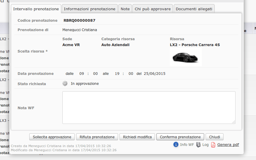 Ulteriori funzionalità. Quando la prenotazione entra nel flusso approvativo, per ogni stato in cui si trova la richiesta, è possibile inserire delle note da parte dagli attori coinvolti (richiedente e approvatore) che verranno allertati via mail. Si potrà innescare quindi un dialogo tra gli attori senza che la richiesta cambi stato agevolando la decisione o meno dell'approvazione della prenotazione stessa.