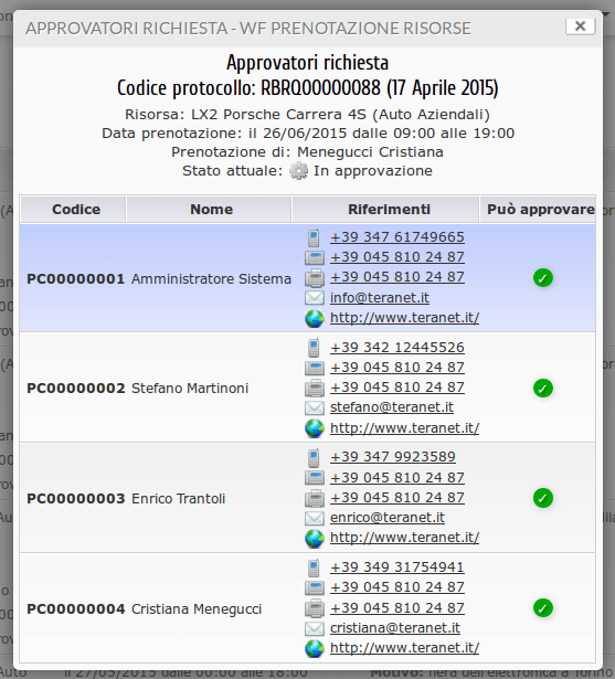 Per ogni richiesta si possono vedere gli utenti che possono approvare e i loro contatti (telefono ed email). Infine, è disponibile la funzionalità di Sollecito approvazione che invia una mail agli approvatori per la presa visione della richiesta.