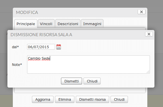 - Per una risorsa già esistente è possibile indicarne la dismissione specificando la data e una nota. Verranno disdette eventuali prenotazioni attive in riferimento alla data indicata e gli utenti interessati verranno informati tramite mail.