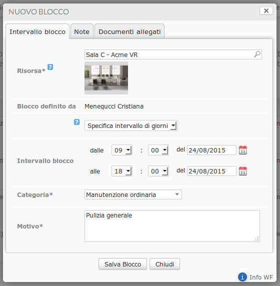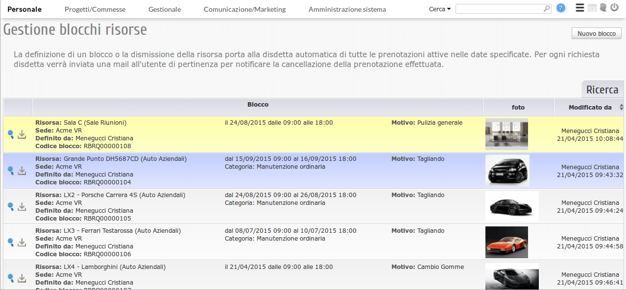 Nel caso in cui una risorsa risultasse non disponibile, ad esempio a causa di guasto o manutenzione, è possibile attivare il blocco delle prenotazioni per quella risorsa. Le prenotazioni già attive verranno automaticamente annullate e gli utenti interessati saranno notificati della disdetta della loro prenotazione.