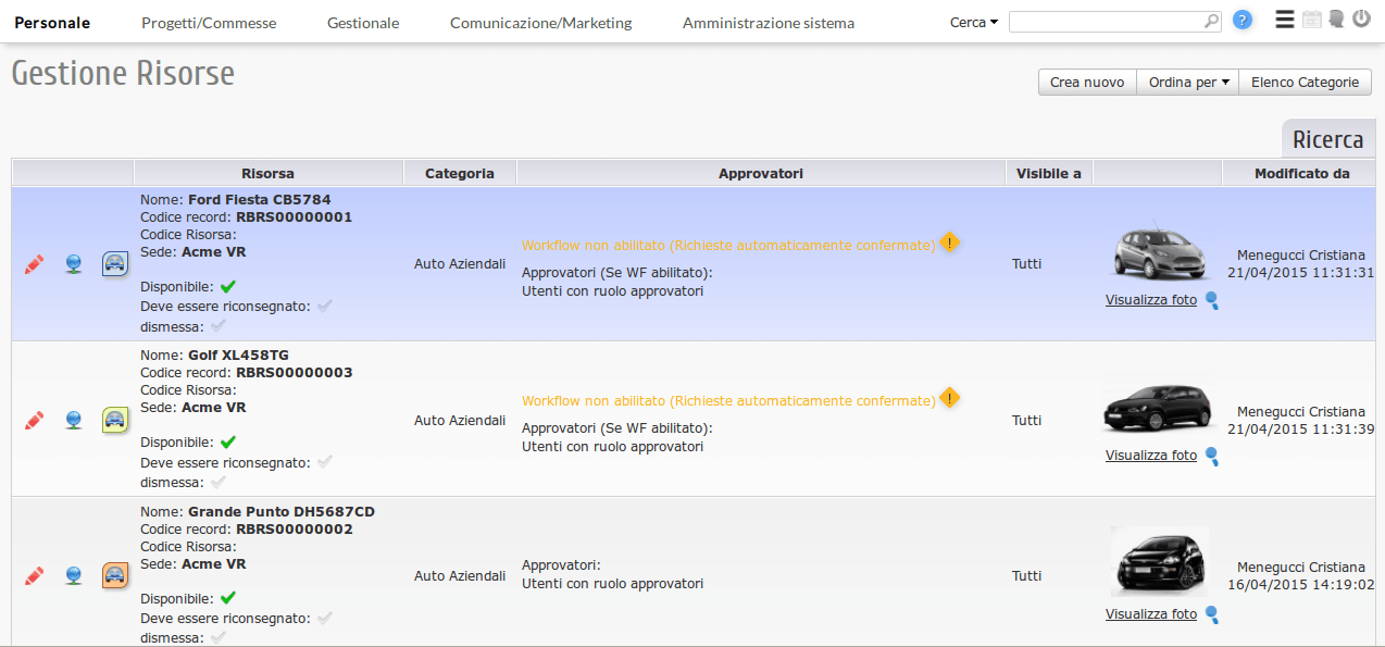 - Definire le categorie (ad es, Auto aziendali, Sale Riunioni, Sale formazioni, Proiettori, Notebook, ecc.) specificando: