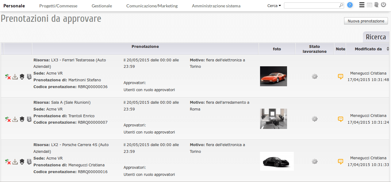 L'elenco Prenotazioni da approvare permette una consultazione accentrata e veloce per agevolare il lavoro dell'approvatore. Oltre alla conferma, può richiedere modifiche, rifiutare la prenotazione e allegare eventuale documentazione.