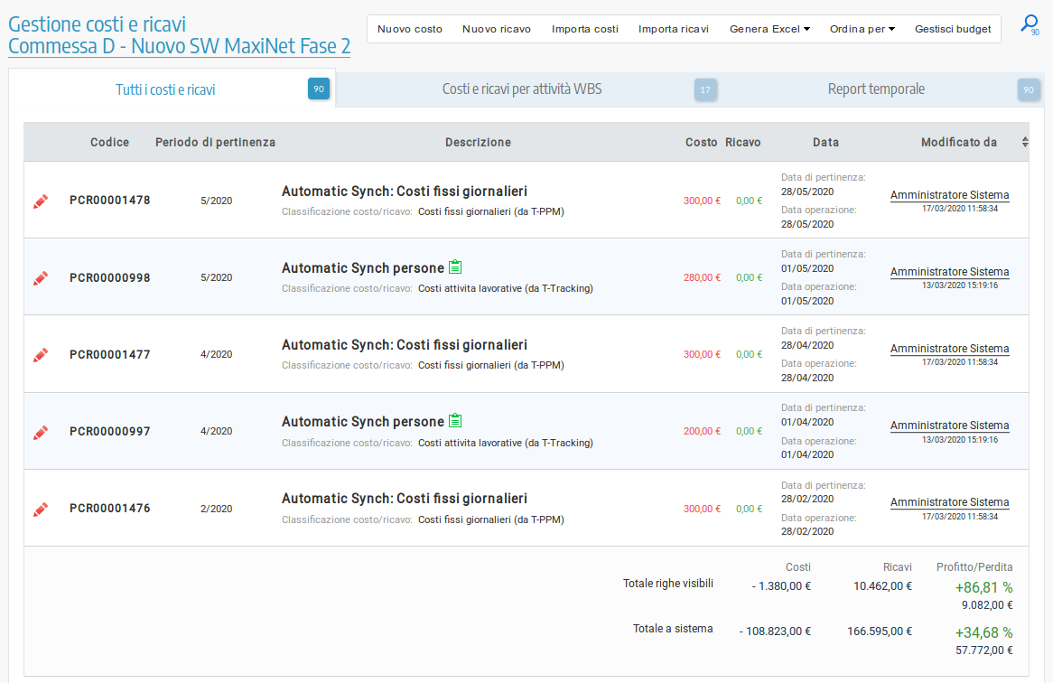 Pannello di gestione dei costi di progetto effettivi con automatismi sul costo del personale e di struttura