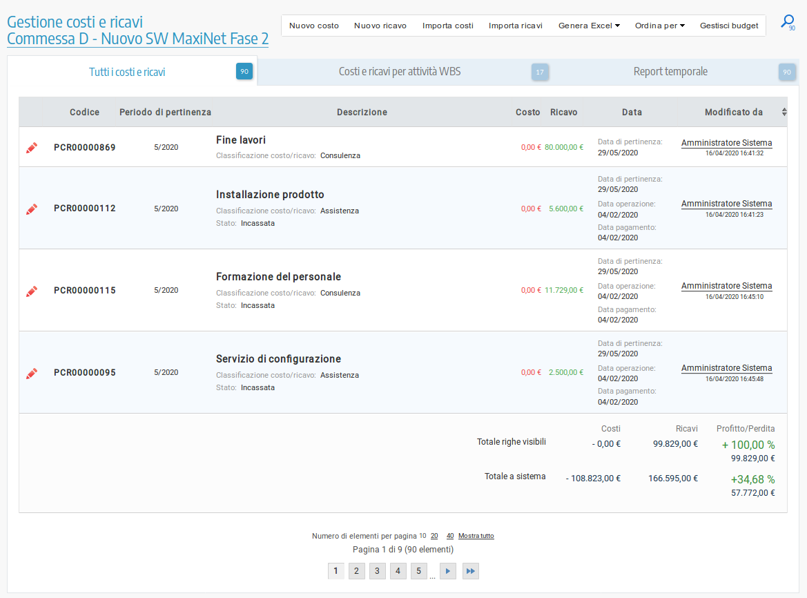Valuta in tempo reale le somme dei costi e ricavi, il profitto o perdita delle righe visibili in elenco e del totale di progetto. Associa i costi e ricavi, sia pianificati che reali, alle attività della WBS per avere un miglior dettaglio di analisi.