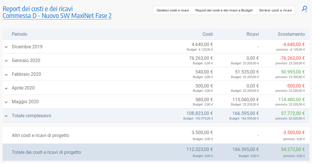 Impostare il budget di progetto anche per fasi temporali consente di verificare la bontà del progetto prima ancora che parta. L'andamento temporale permette di tenere sotto controllo le spese in corso d'opera della commessa rispetto a quanto pianificato e potere riportare il progetto, se necessario e possibile, in linea con quanto atteso.