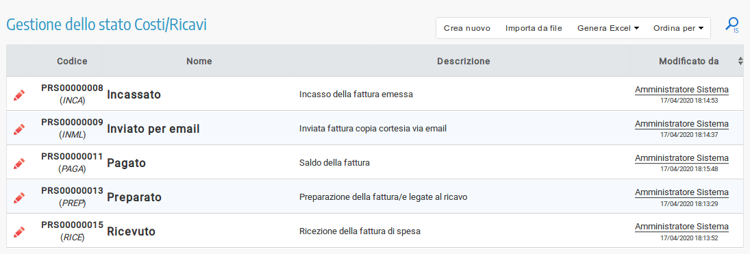 Pannello di amministrazione per la classificazione degli stati dei costi e ricavi di progetto