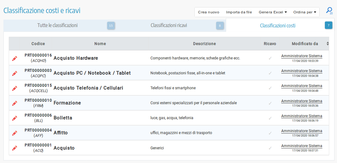 Pannello di amministrazione per la classificazione delle tipologie dei costi e ricavi di progetto