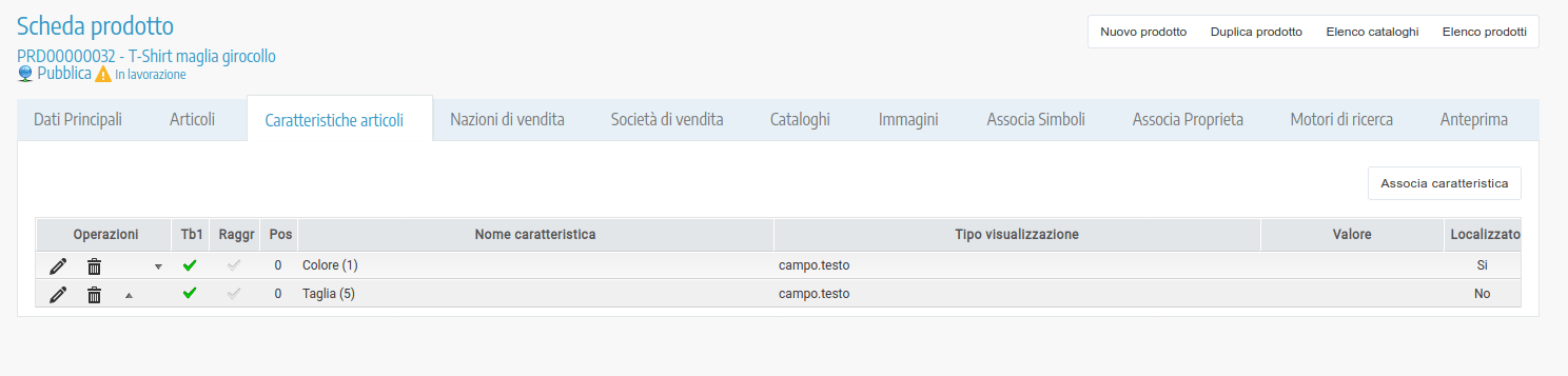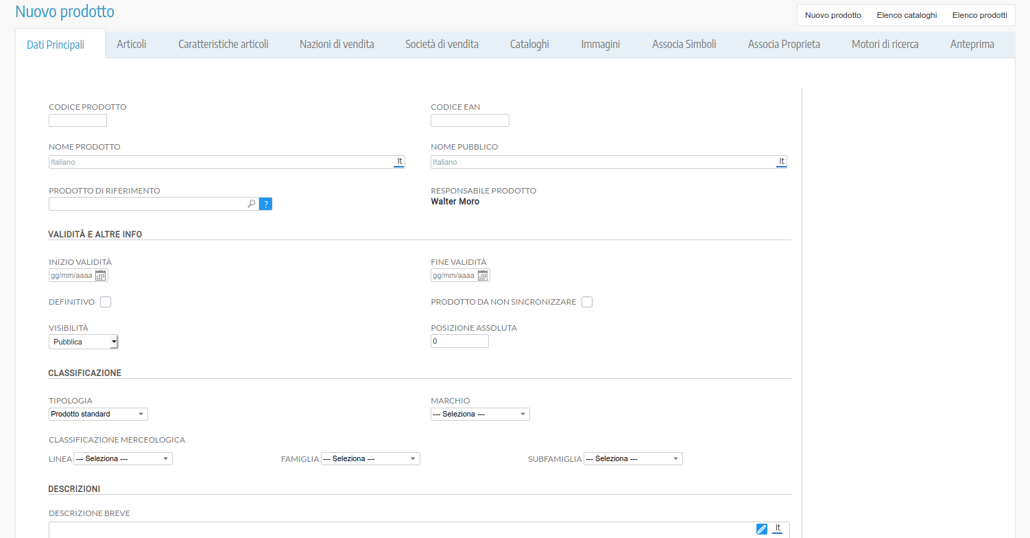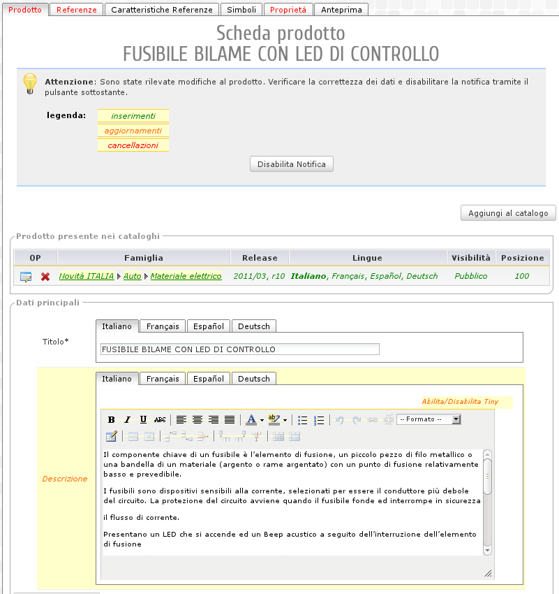 • Definisci il prodotto o servizio con contenuti multilingua e popolando strutture dati ottimizzate per i motori di ricerca; specializza ogni prodotto definendone le caratteristiche o i dati tecnici semplici o multilingua; carica le immagini per il web e quelle ad alta definizione; associa simboli e proprietà pertinenti; allega eventuale documentazione - manuali, istruzioni per l'uso, certificati etc.