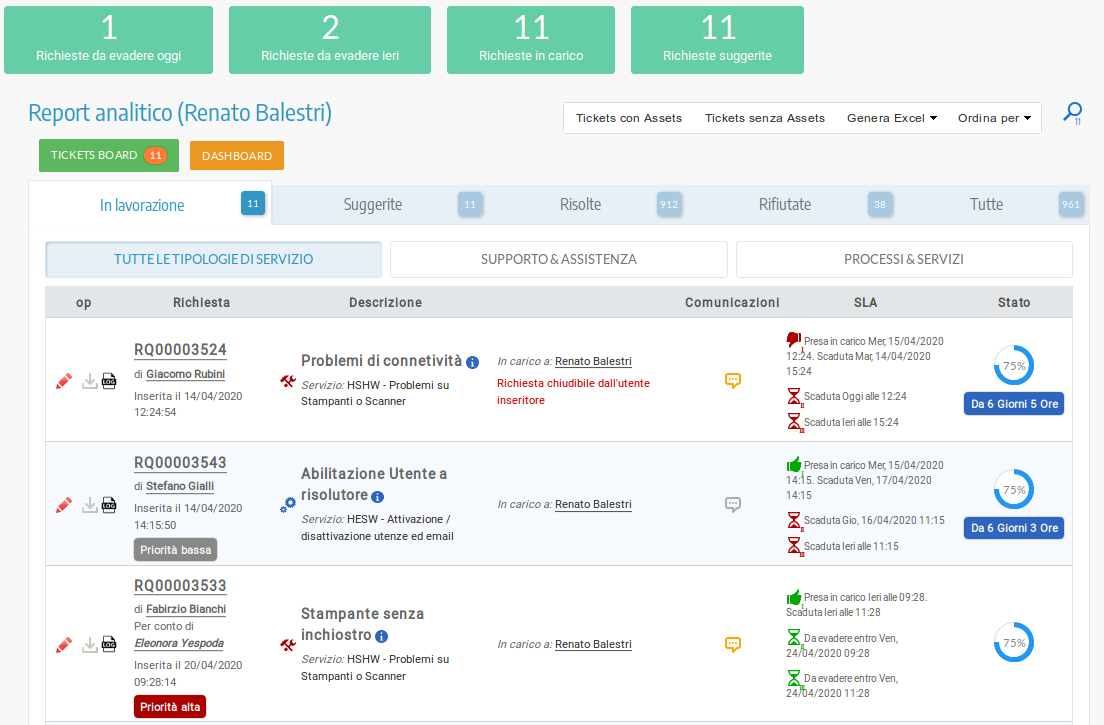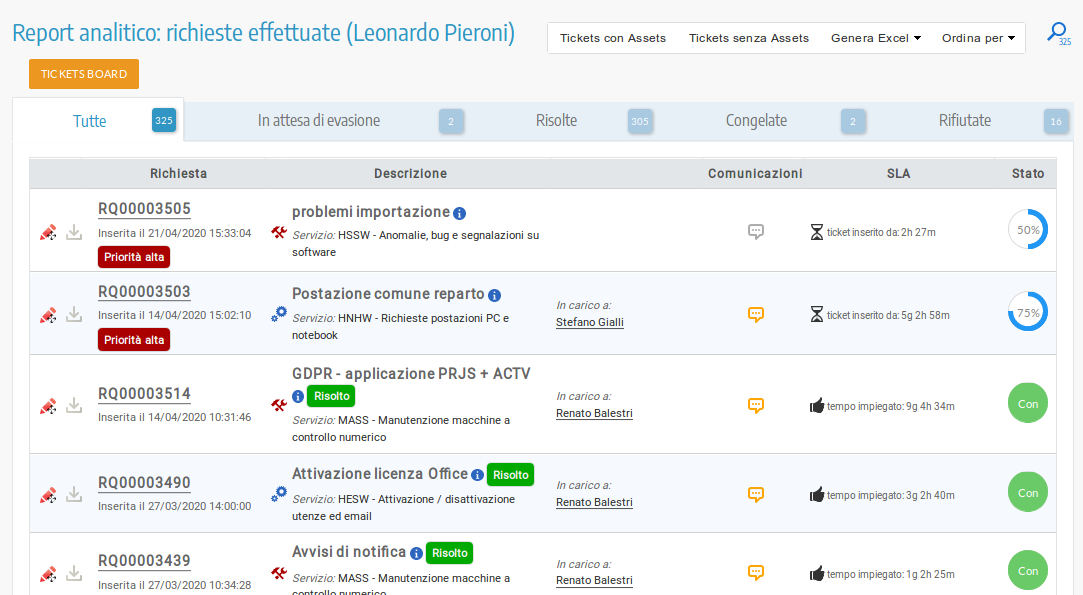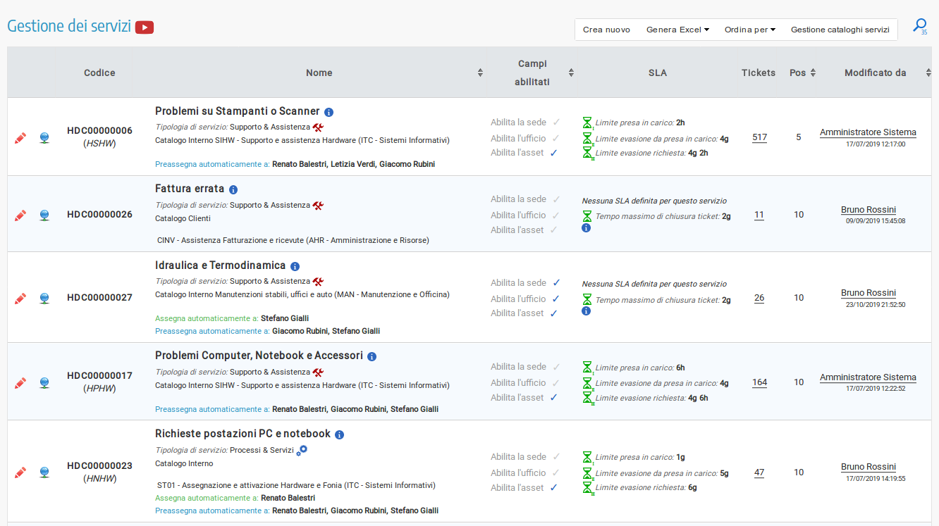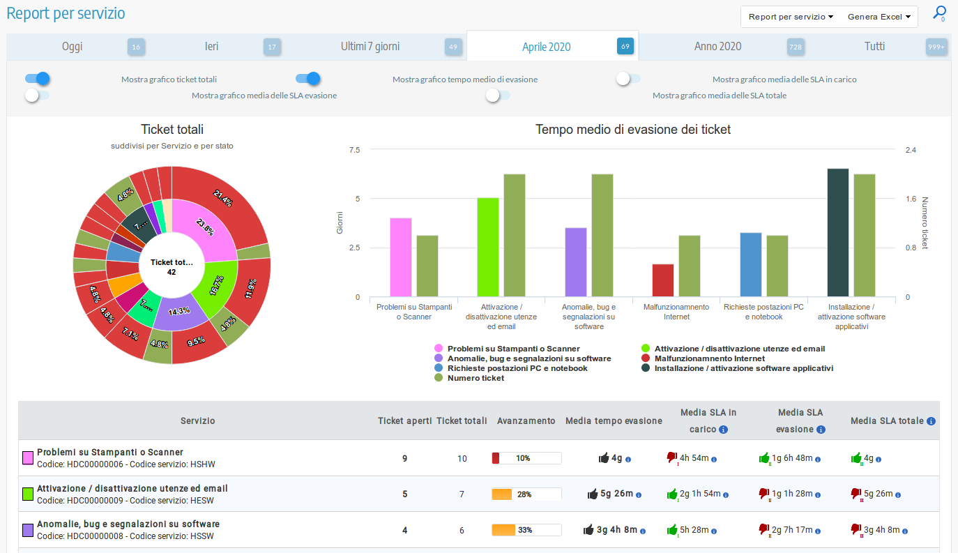 Per ogni servizio offerto ai propri utenti è possibile gestire delle SLA (Service Level Agreement) personalizzate. Grazie alla possibilità di definire livelli di servizio personalizzato sarà possibile puntare ad offrire un servizio migliore e misurabile nel tempo. Le SLA possono essere inoltre definite a livello dell'intero sistema di ticketing, rimanendo sempre e comunque personalizzabili servizio per servizio. Scopri di più.