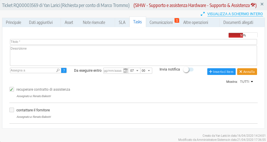 Il pannello Ticket Tasks permette agli agenti risolutori di suddividere i ticket in sotto-tasks organizzabili come checklist. Ogni task della checklist può essere assegnato ad altri agenti risolutori in modo da creare in tutta semplicità un team di lavoro. Scopri di più.